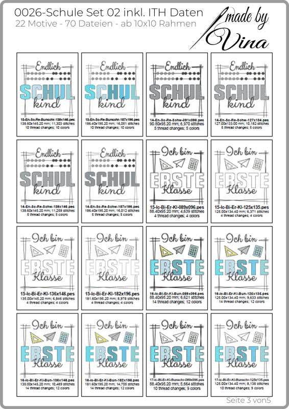 Das Set enthält sowohl klassische Stickmotive als auch praktische ITH-Dateien. Enthalten sind unter anderem ITH-Schulkindbuttons sowie ITH-Stifthüllen, die komplett im Stickrahmen gefertigt werden. Die Motive sind überwiegend im Shabby-Stil angelegt und dadurch leicht, modern und nicht zu dicht gestickt. Farbige und reduzierte Varianten sorgen für maximale Flexibilität bei der Gestaltung.