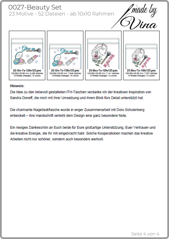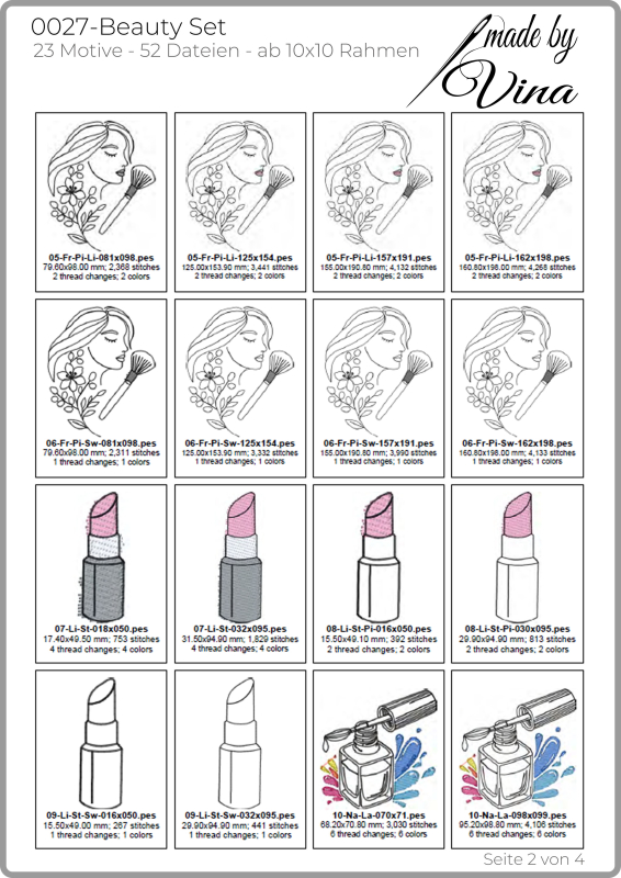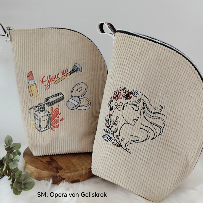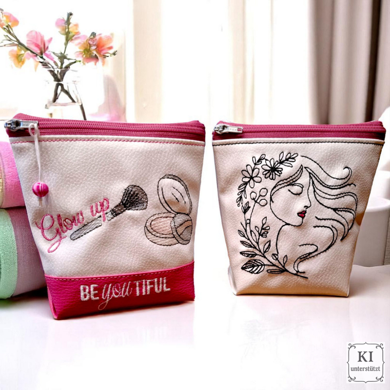 Dieses Beauty-Set vereint moderne Kosmetikmotive mit praktischen ITH-Projekten. Die Stickdateien eignen sich ideal für Kosmetiktaschen, Utensilos, Geschenke oder dekorative Projekte rund um Beauty, Wellness und Schminken. Enthalten sind Motive wie Lippenstift, Nagellack, Puder, Schminkpinsel, florale Frauenporträts sowie passende Sprüche und Schriftzüge.